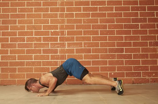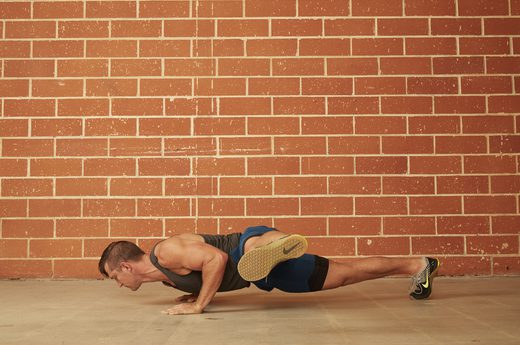 By bringing your knee up to your chest, your abs, shoulders and hip flexors have to work overtime to keep you off the ground. HOW TO DO IT: Begin at the top of the push-up position. Keep your back straight and lower the torso under control. Press back up with your arms, and at the top of the push-up, bring one knee up under the chest. Make sure your foot doesn’t touch the ground. Return your leg to its original position, then lower yourself back down and repeat, lifting the opposite leg. Continue alternating throughout the set