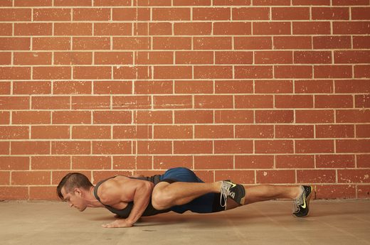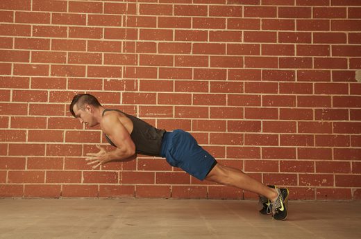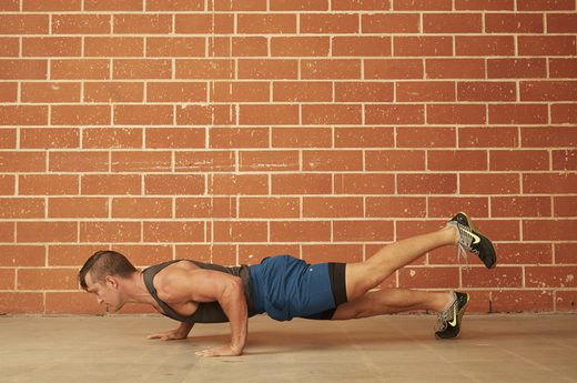 By bringing your knee up to your chest, your abs, shoulders and hip flexors have to work overtime to keep you off the ground. HOW TO DO IT: Begin at the top of the push-up position. Keep your back straight and lower the torso under control. Press back up with your arms, and at the top of the push-up, bring one knee up under the chest. Make sure your foot doesn’t touch the ground. Return your leg to its original position, then lower yourself back down and repeat, lifting the opposite leg. Continue alternating throughout the set